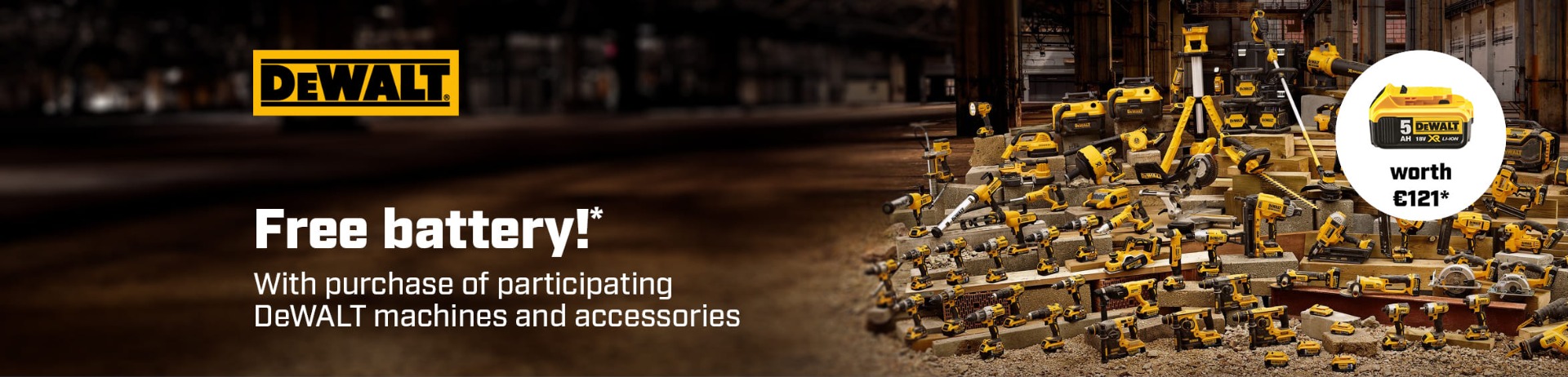 Now with the purchase of DeWALT tools and accessories, free 18V 5.0Ah battery!*